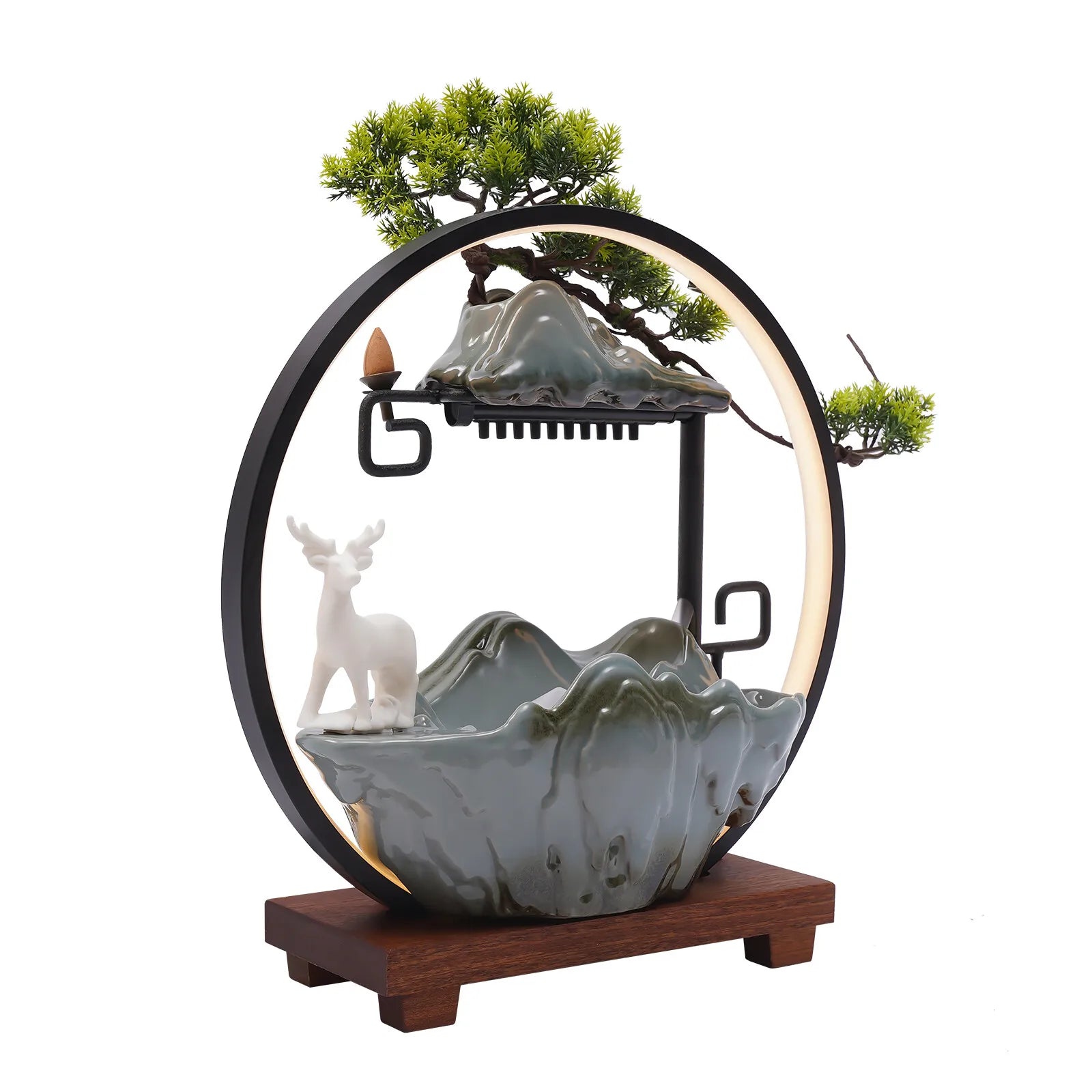 Experience tranquil elegance with the 110V Ceramic Tabletop Fountain With Mist LED Deer Figurine And Pine Branches. Crafted from ceramic and enamel and set on a natural wood base, this captivating piece combines soothing mist, warm LED illumination, and a charming deer figurine atop pine branches to create a serene, spa-like atmosphere in any room.