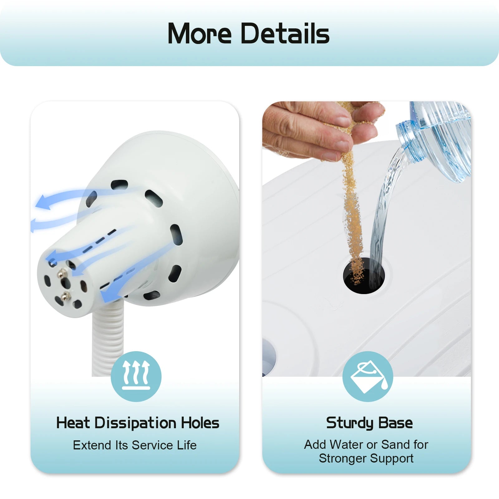 - Durable construction: high-quality ABS and stainless steel ensure long-lasting performance. The stable base can be weighted with sand or water to prevent tipping, and a stainless steel net protects the bulb from direct contact.