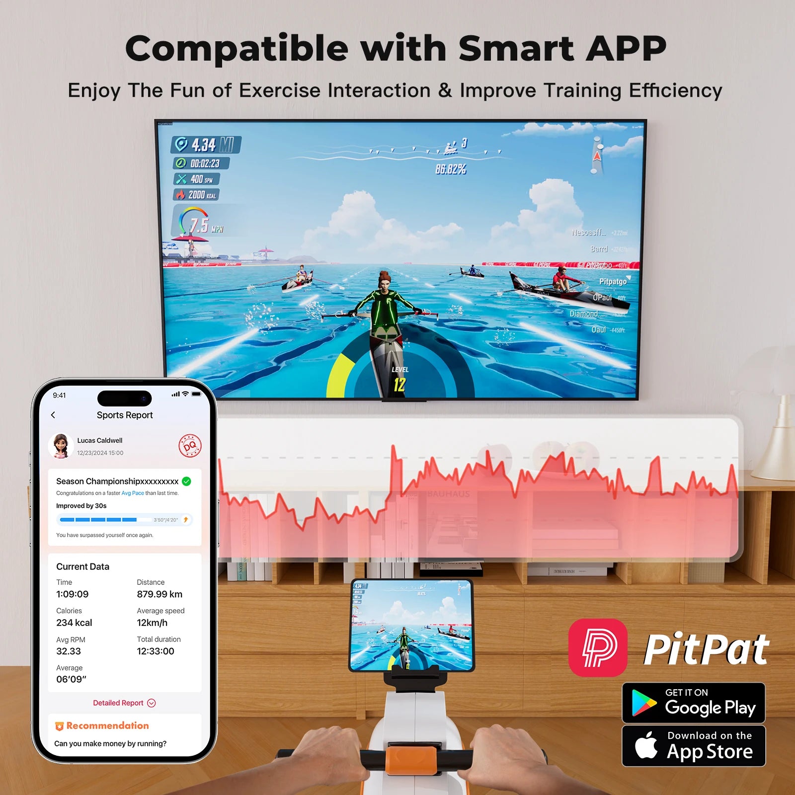 - LED data display keeps track of time, distance, calories, speed, and resistance, and a device stand lets you watch PitPat classes or join multiplayer sessions via Bluetooth.