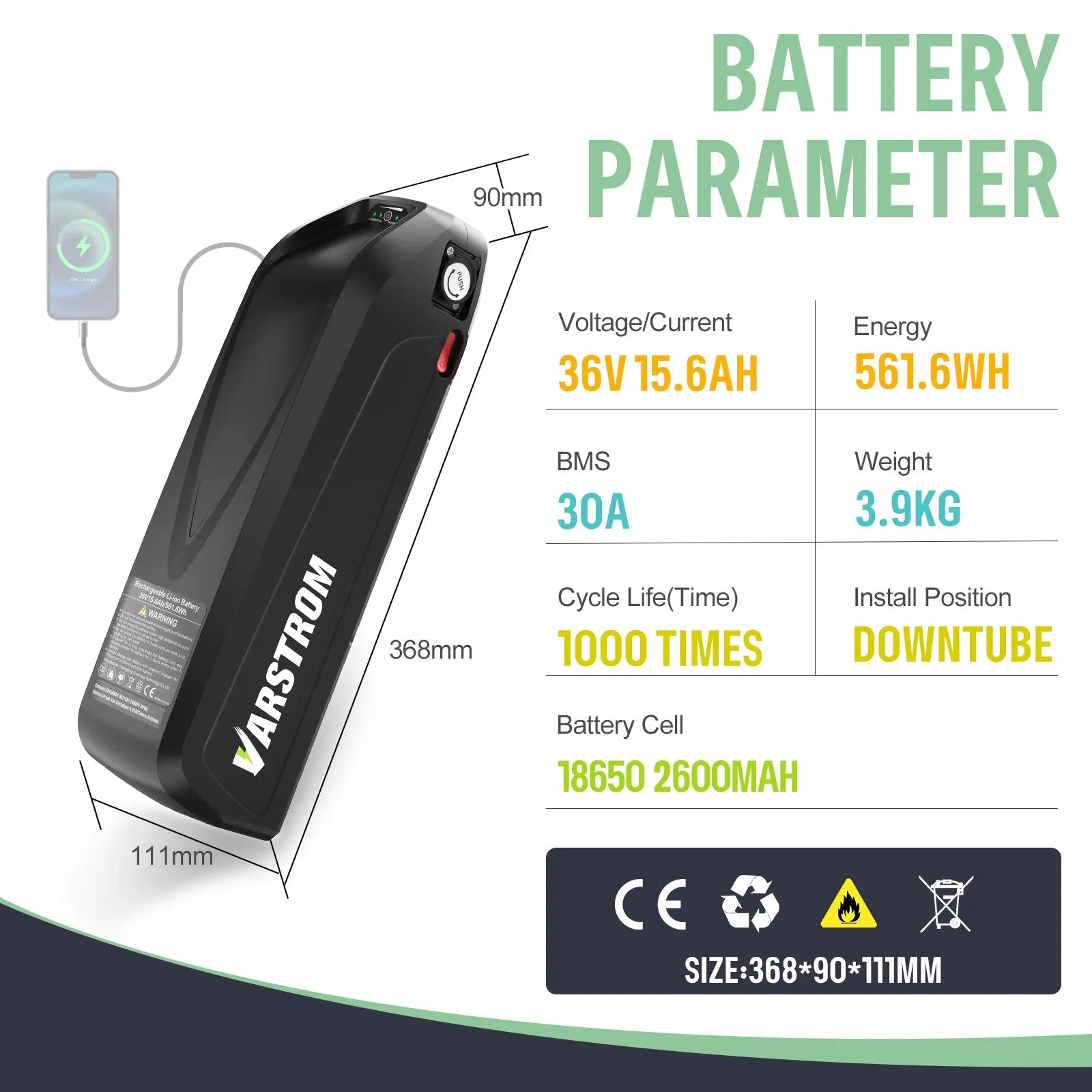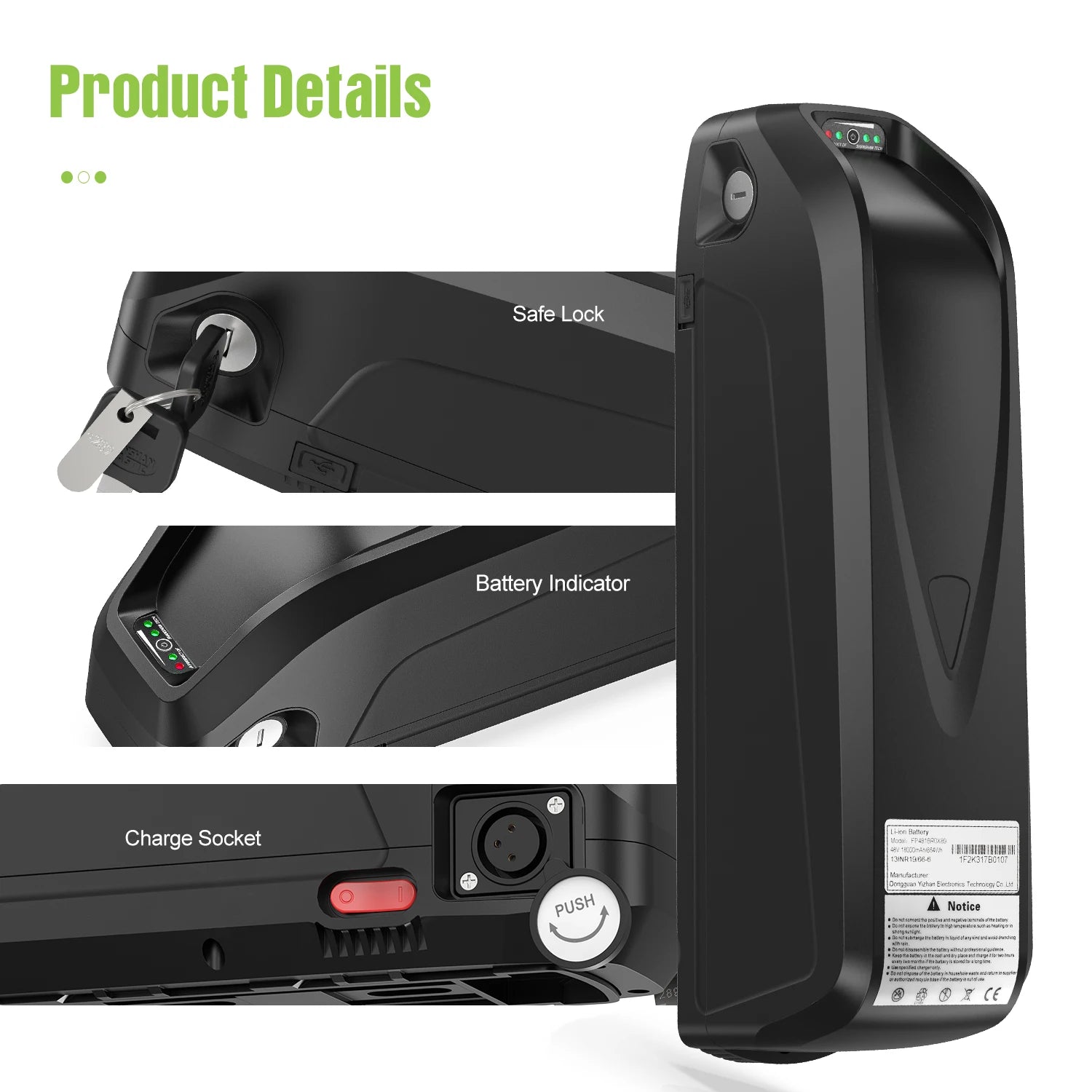 Built for safety and durability, this battery features a robust 30A BMS protection board that guards against overcharge, over-discharge, over-current, short circuit, high-temperature, and over-voltage events. It includes a built-in battery holder and a mounting bracket, so you can install it on most down tubes using standard water bottle screw holes. For added convenience, the battery is removable for easy charging anywhere, secured with a lock to prevent theft, and equipped with a USB port to charge your phone or small devices on the go. An on/off switch and indicator light provide clear, at-a-glance power status and safer operation.
