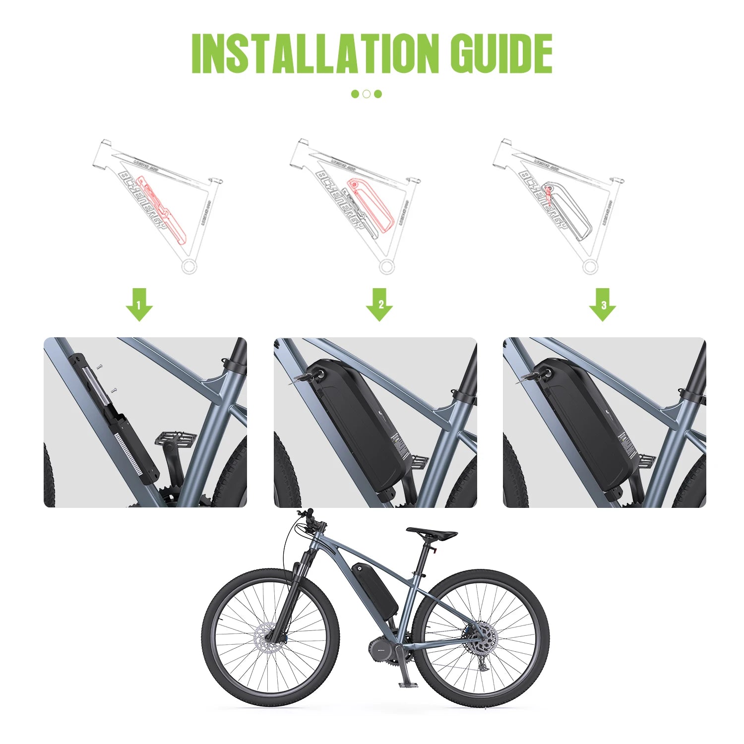 - Mounting bracket and battery base for easy installation on most down tubes with water bottle screw holes